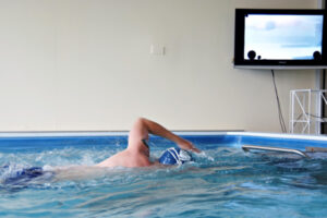 Our Swim Studio features above-ground Endless Pools set at a comfortable 90 degrees. This calm, controlled environment is free of distractions like crowded lanes or noisy classes. Your coach is in the water with you, right at your side, offering real-time adjustments as you swim in place over mirrors. Even in a group class, we adjust the current speed to match your skill level—so the lesson is always personalized to you